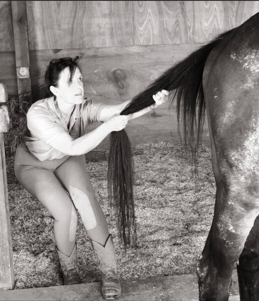4. Many horses enjoy “Gluteal stretches.” This exercise is usually simple for the horse, as they just stand and let their human do most of the work. The goal is to create a stretch that opens up the horse’s pelvic angles, accessing the iliopsoas and gluteal muscles. Stand behind your horse (carefully!) and place your hands a few inches to either side of the base of the tail. Slowly rub your fingers (for some you may need to use your nails at least until you have learned exactly where but begin with the tips of your fingers and gradually increase the pressure) down the muscle repeatedly, increasing pressure each time until you begin to notice a response. You should see your horse’s lower back lift and his pelvis tilt slightly. This massage-type movement is great to do (after he is warm) before and after riding. You can also stretch using the tail after exercise or a nice warming massage. I hold the tail up and wiggle just a little before I start to help the horse be ready for a slow and strong stretch straight back. Most horses naturally tilt their pelvis to make the most of this, but some do the opposite, dipping the back. If yours is one of the latter, I’d advise stopping this stretch and getting a bodyworker to have a look at him first.