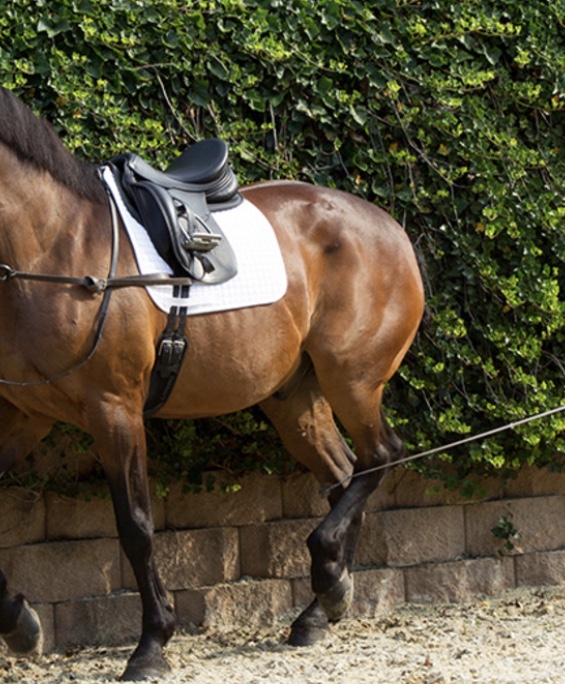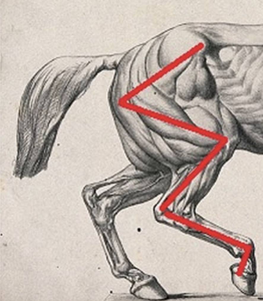 2. A quality rein-back that is slow and precise will build strength in the hind end. I prefer to back my horse straight up small inclines when possible. A few even steps backwards uphill during regular sessions will improve muscle tone in his Gluteus Superficialis and Biceps Femoris muscles. This exercise can be done under saddle or in-hand. Avoid pulling on the reins to back your horse, as this causes his back to drop and restricts his hind end. Instead, try using a rope around the base of his neck that you can lift to help him move more correctly. The half-halt, well done, offers a similar effect during movement, asking your horse to engage his motor at the back more before continuing forwards.