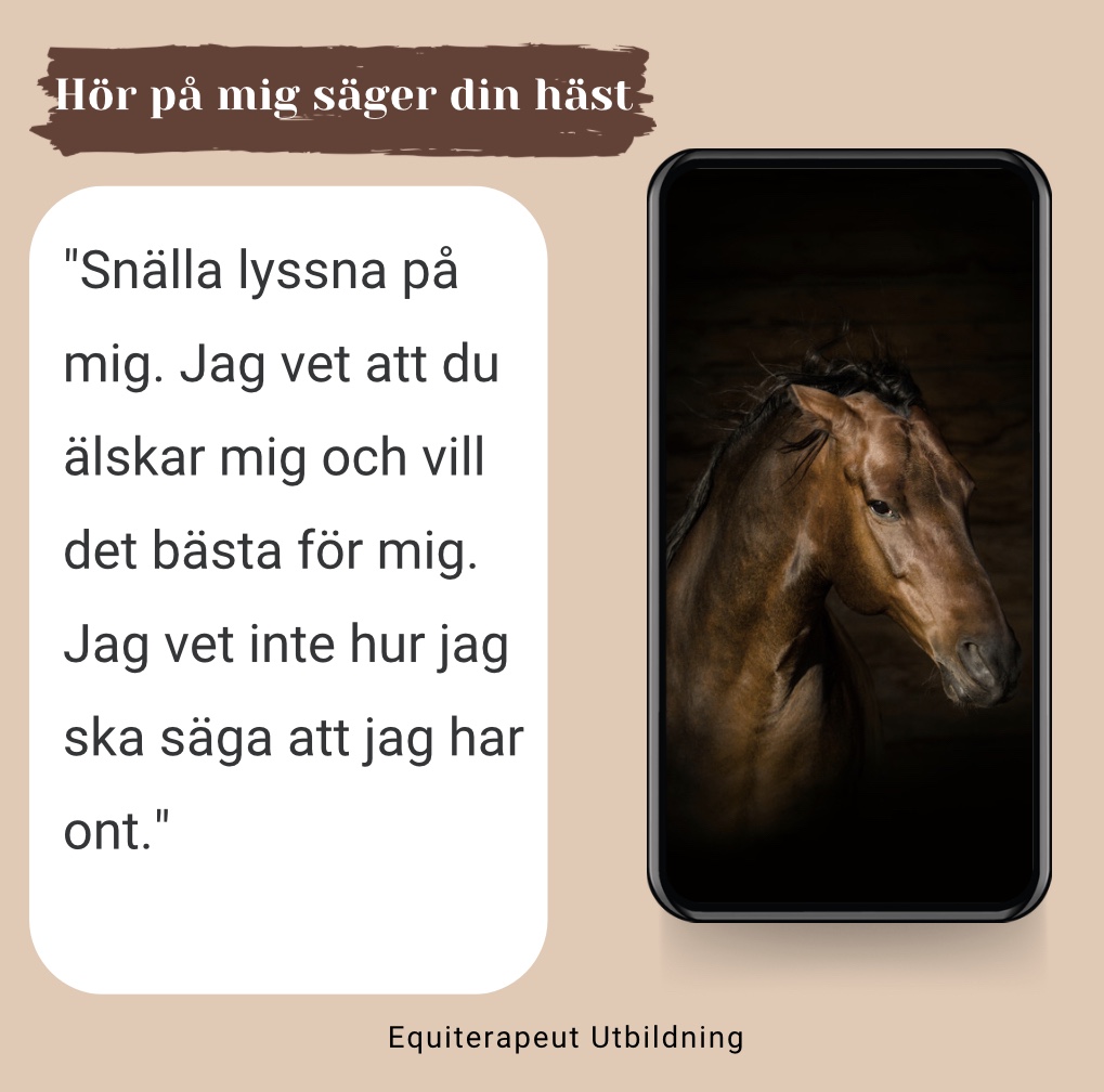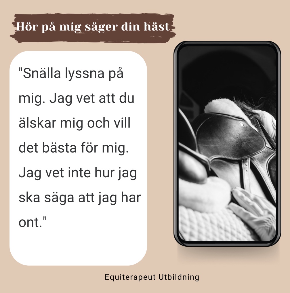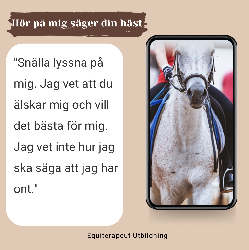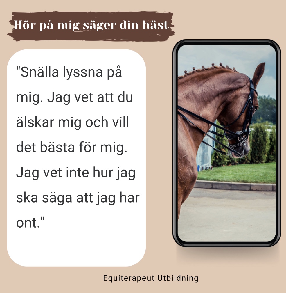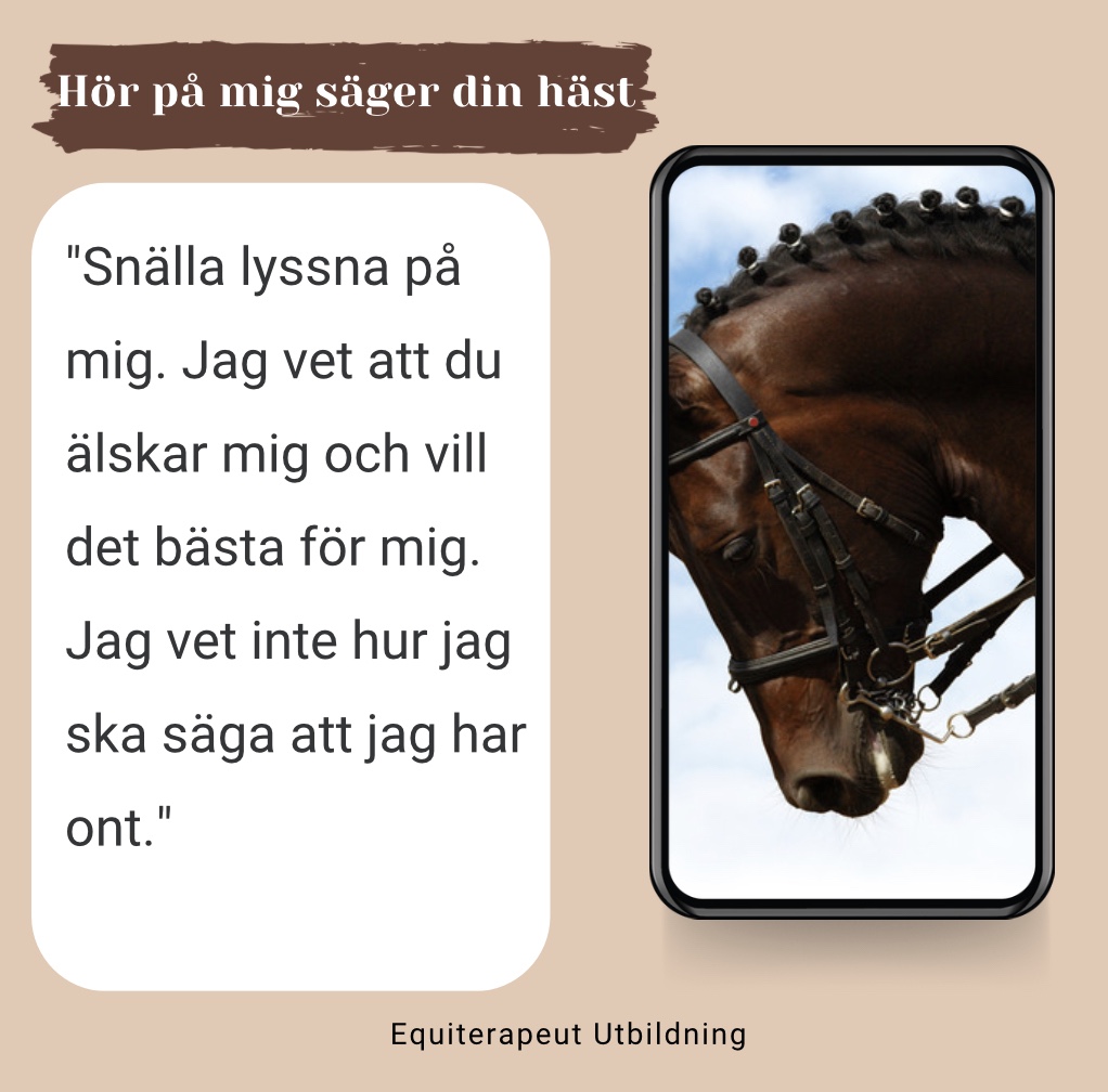 Jag gör mitt bästa för att fly från smärtan, men det fungerar inte eftersom du håller mig tillbaka. Oavsett hur snabbt jag rör på fötterna i skritt, i trav eller i galopp så finns värken kvar. Jag hade hoppats att med tillräckligt med adrenalin skulle jag inte göra så ont. Men det fungerar inte. Jag vill arbeta lugnt, med ett avslappnat och jämnt steg, men jag kan inte göra det förrän jag är mer bekväm. Snälla lyssna på mig. Jag vet att du älskar mig och vill det bästa för mig. Jag vet inte hur jag ska säga att jag har ont.