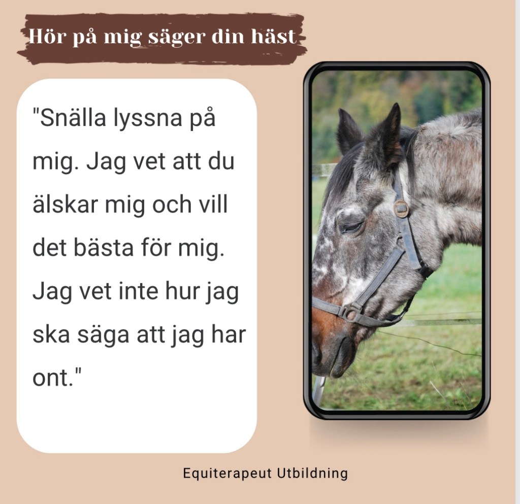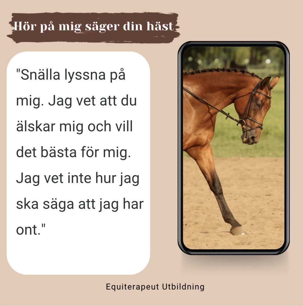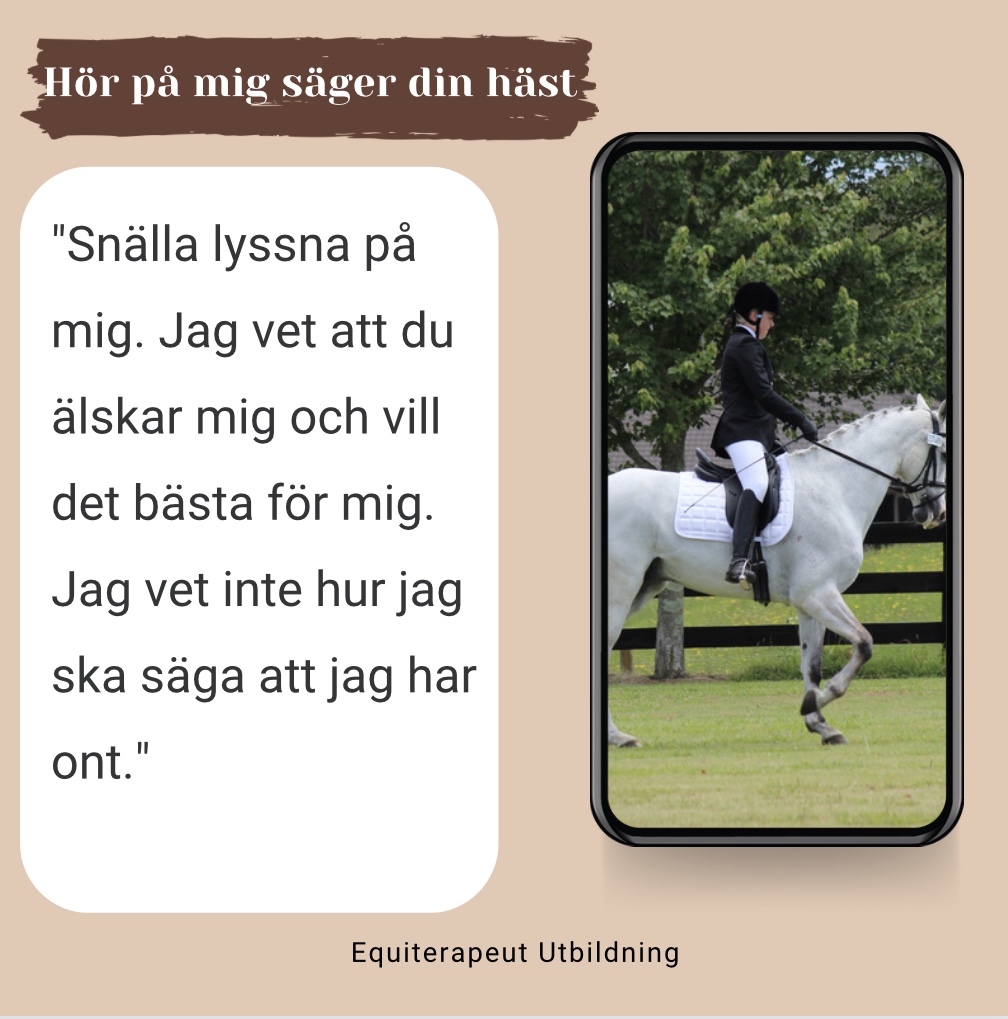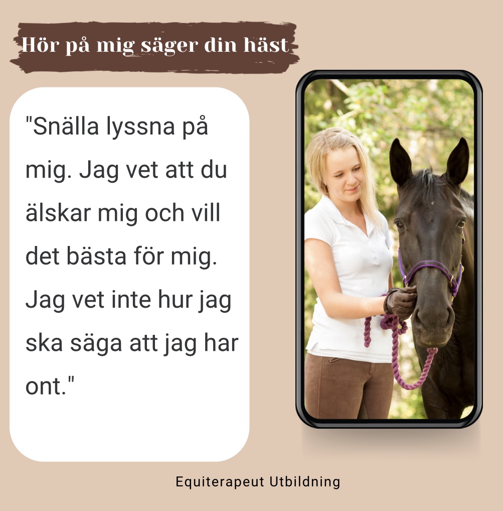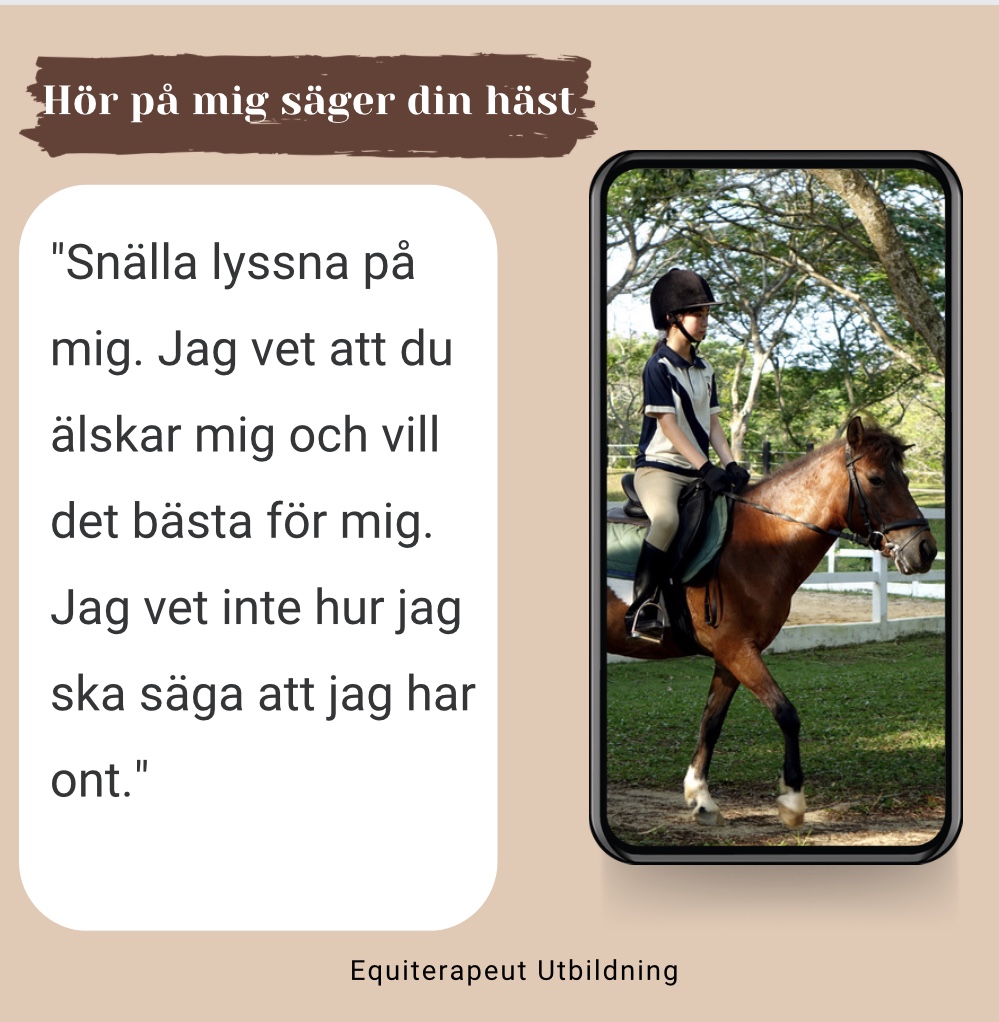 Jag gör mitt bästa för att fly från smärtan, men det fungerar inte eftersom du håller mig tillbaka. Oavsett hur snabbt jag rör på fötterna i skritt, i trav eller i galopp så finns värken kvar. Jag hade hoppats att med tillräckligt med adrenalin skulle jag inte göra så ont. Men det fungerar inte. Jag vill arbeta lugnt, med ett avslappnat och jämnt steg, men jag kan inte göra det förrän jag är mer bekväm. Snälla lyssna på mig. Jag vet att du älskar mig och vill det bästa för mig. Jag vet inte hur jag ska säga att jag har ont.