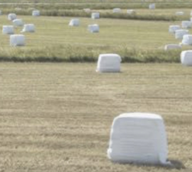 Haylage is usually made from different types of moist grasses. It is different to wrapped hay, which hay made in the usual way by waiting for it to dry, then wrapping it in plastic to prevent rain from spoiling it. Often slightly moister than hay, wrapped hay can be wrapped a little earlier than unwrapped and can be used where the weather has changes and getting in the crop before it spoils becomes a priority.