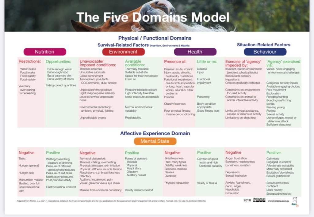The Five Freedoms concept is nowadays an inadequate tool for assessing animal welfare due to some key points. Firstly, the Five Freedoms concept does not refer specifically to positive experiences. Secondly, it disregards the role some negative experiences have in keeping animals alive. Thirdly, it refers to only a small proportion of the mental experiences animals can have. An alternative to the Five Freedoms is therefore needed. Dr Mellor has developed a model now named the five domains as a more appropriate framework for looking at animal welfare and this model can be applied to how we care for our horses as much as how wild, agricultural or zoo animals are cared for.