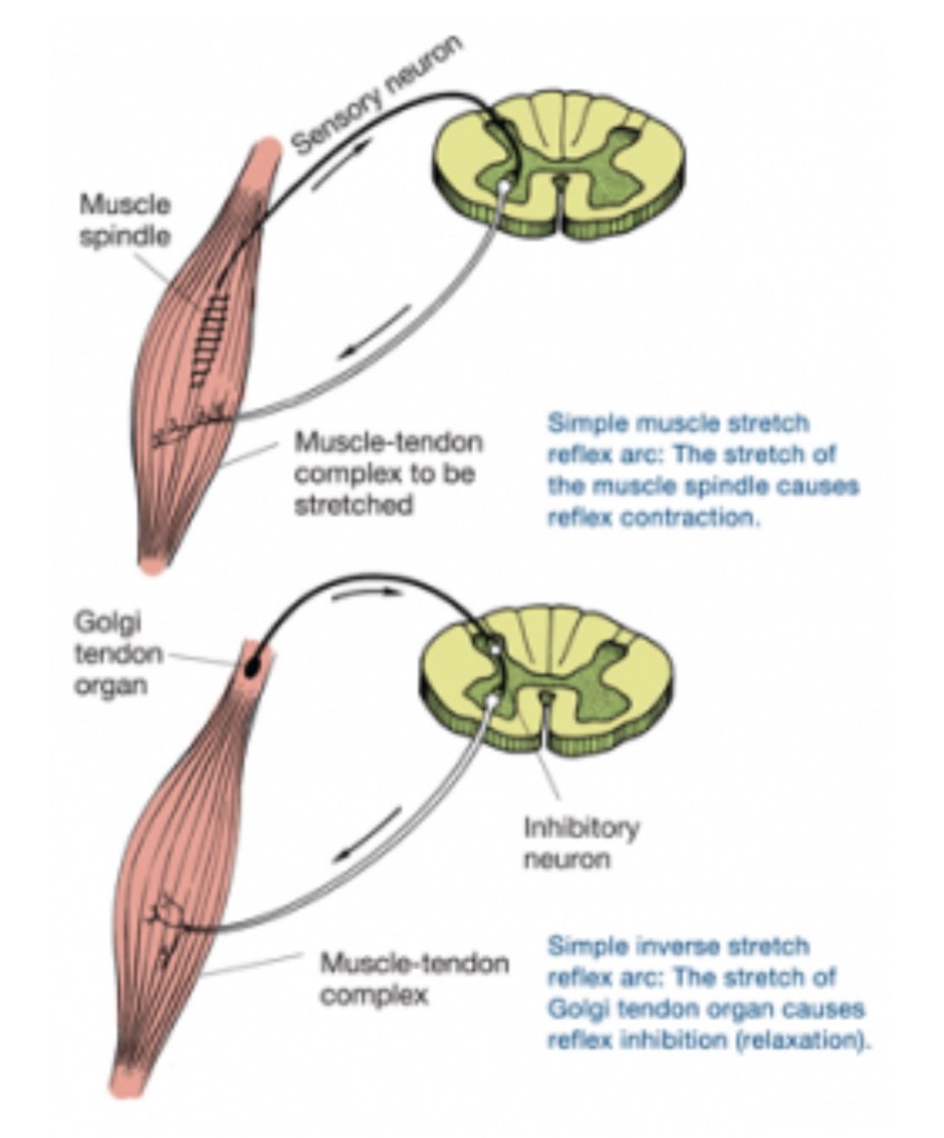 Autogenic and reciprocal inhibition both occur when certain muscles are inhibited from contracting due to the action of the golgi tendon organ (GTO) and the muscle spindles. Two musculotendonous receptors located in and around tendon attachments to bones, respond to change in muscle tension and length resulting in regulation and aiming to prevent over contraction and damage to the tendon or muscle itself.