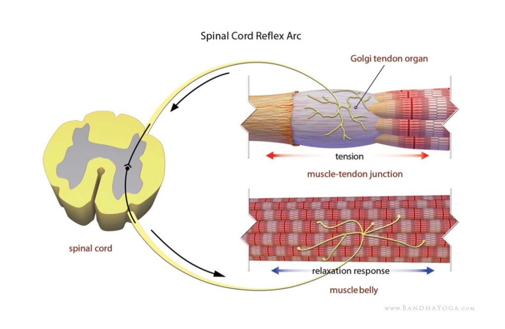 The GTO is located between the muscle belly and tendon and recognises and responds to the tension changes when the muscle contracts or stretches. When the muscle contracts, the GTO responds by inhibition of the contraction to prevent damage. This inhibition response is known as reflex inhibition. The GTO also controls the opposing muscle group known in literature as antagonist. In order to smoothly alter the contraction of one muscle, it’s antagonist is stimulated to begin contracting, taking the strain from the original contracting muscle and resulting in it relaxing. This process is autogenic inhibition. The GTO in each musculotendinous connection regulates this through sensory and motor neurons to and from the central nervous system.