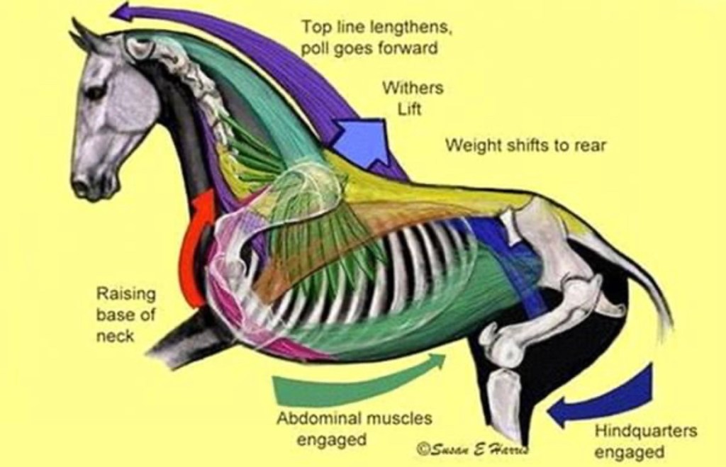 The interspinous ligament is actually a continuation of the supraspinous ligament ? This is the suspension cable that keeps your horse’s top line together and so stretches to this cable can offer a conservative (ie. non surgical approach when combined with muscle movement education and corrective tack decisions). An equine veterinary surgeon I spoke with identified a further problem for her in this kind or surgical treatment as that cutting the ligaments is not a ‘one and done’ procedure as ligaments can heal and grow back (but with scar tissue which is generally less flexible than normal tissue). She identified a frustration that for a few cases they returned, requiring a further similar procedure! A further issue connected to that is that, if the operation is done without appropriate rehabilitation afterwards, the horse returns to the same movements with the same tack and rider and one can expect similar problems to reoccur – not in every horse but in many.