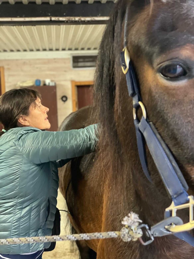 While many horses and ponies learn this practice is ‘what humans do to me,’ I do not believe it is the best way to perform bonding activities like grooming or massage. (Anthropomorphic example would be tying you to a massage table and applying massage techniques without asking if the pressure is correct or not).