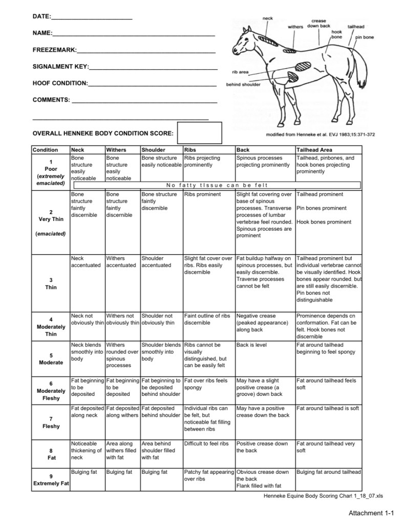 The Henneke horse body condition scoring system is a numerical scale used to evaluate the amount of fat on a horse’s body. It was developed in the early 1980s by Don Henneke at Texas A&M University with the goal of creating a universal scale to assess horses’ bodyweight, and was first published in 1983. It is widely accepted and because it has been adapted to offer us pictures of how each area appears horse owners can easily assess their horses in terms of condition and keep a note over time and in relation to feeding and exercise changes.