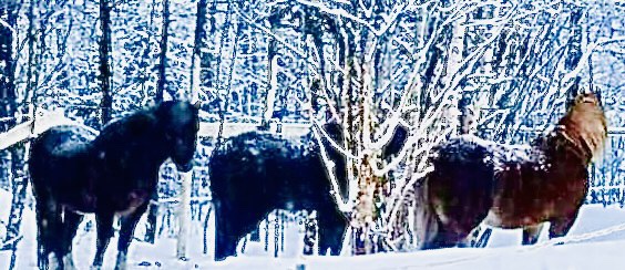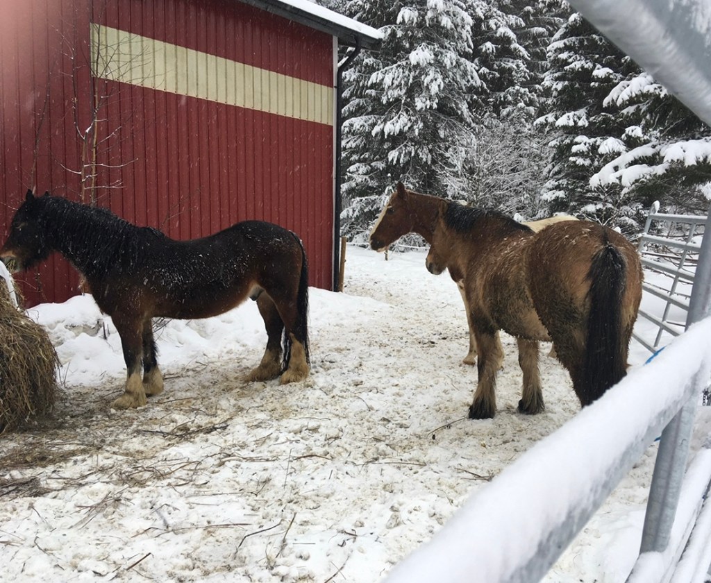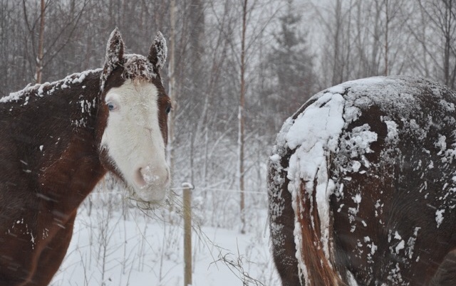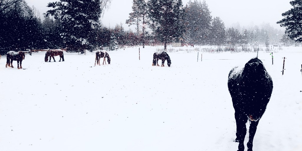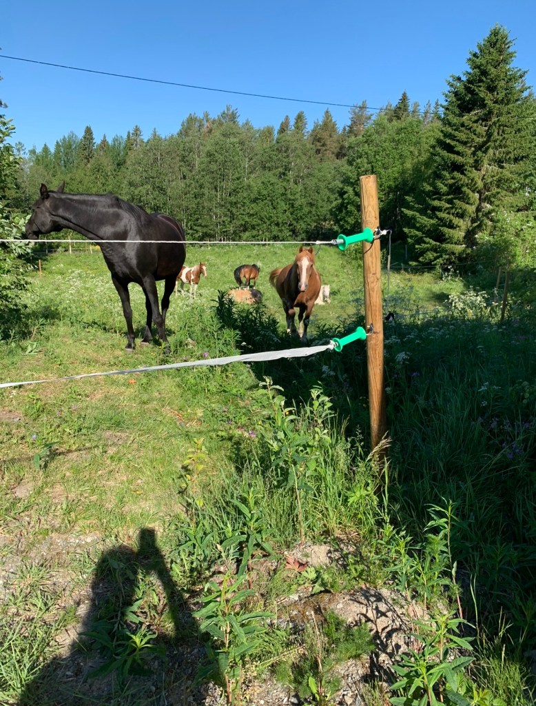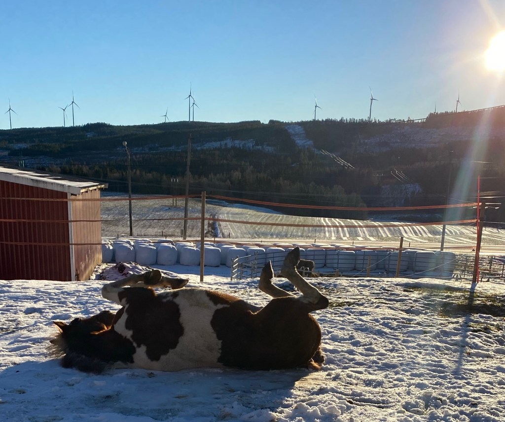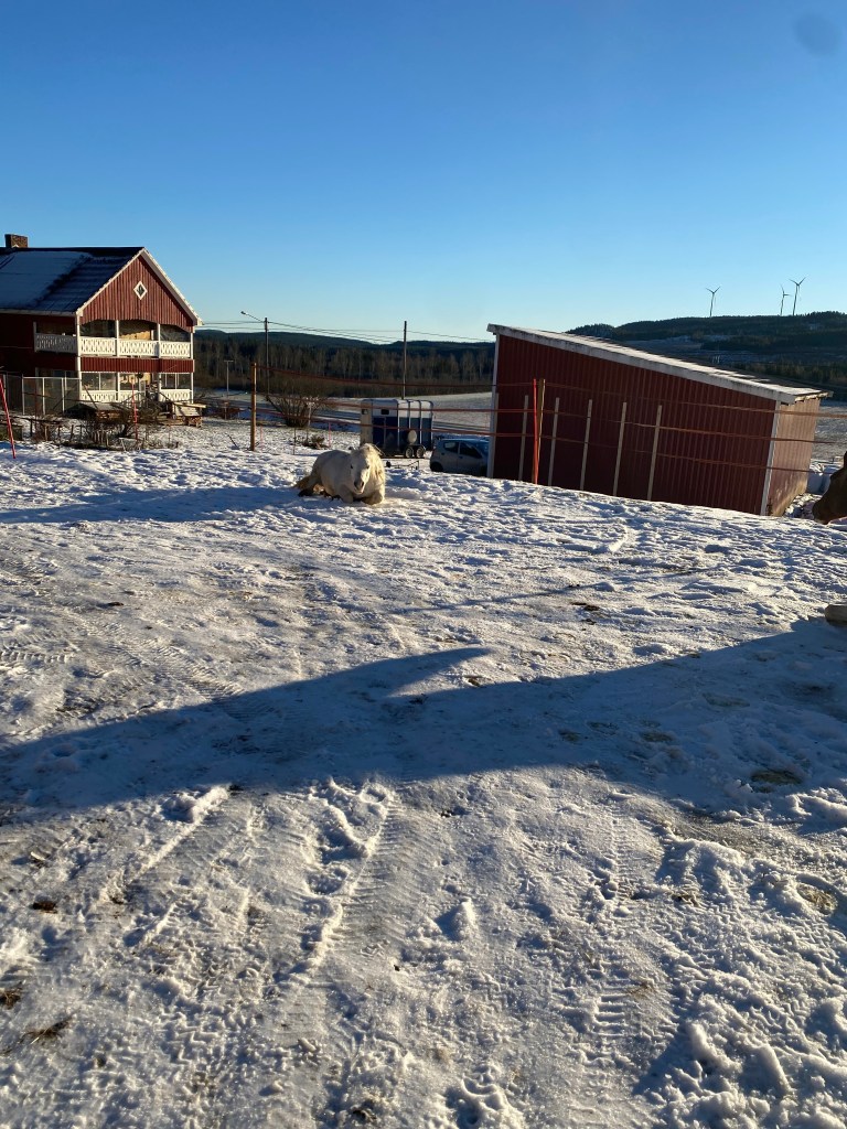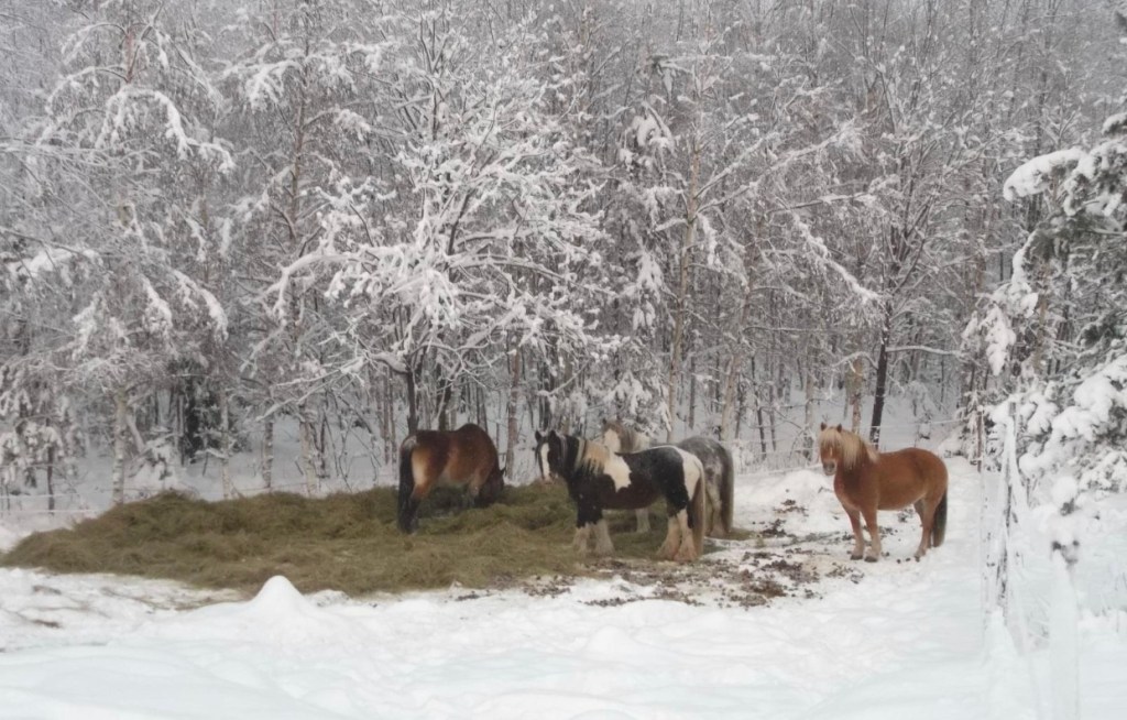 I have to limit my little group of six ponies and horses in winter as my electric fencing doesn’t currently (yup another of my awful puns) stand up to the unintentional attacks of enthusiastic elks and I don’t fancy walking the miles in the deep Swedish forest snow following where my horses might wander if ‘let out’ by a friendly moose! But I can try to offer them a slightly more interesting life with slightly more choices than simply standing in a small paddock and eating a large bale of hay. I have a ‘ligghåll’ (a large shelter barn that easily accommodated them all loose and which can be shut at night if I am nervous of the local wildlife or for weather based emergencies) and a fenced track with a wooded area for them to take shelter and explore the hay piles I drop there (in different places every few days). It isn’t ideal and if I win the lottery I will drastically improve my fencing in one go (rather than the rather slow process I am attempting annually just now) and give them a much bigger and more interesting area.