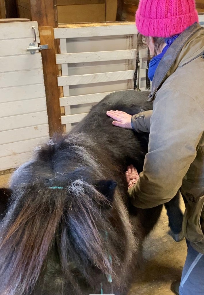 My favourite way of working though for massage and light touch Ki-Equine technique is to be loose in a paddock or shelter barn with the horse and his or her friends. I love doing this at my colleague, Jolande’s Hästgård Mosjö Stall. Her horses have a lot of choices in their lives, despite being in a western riding Center with both lessons and trail rides and this freedom and herd life shows up in their acceptance and conversation around any bodywork I offer.